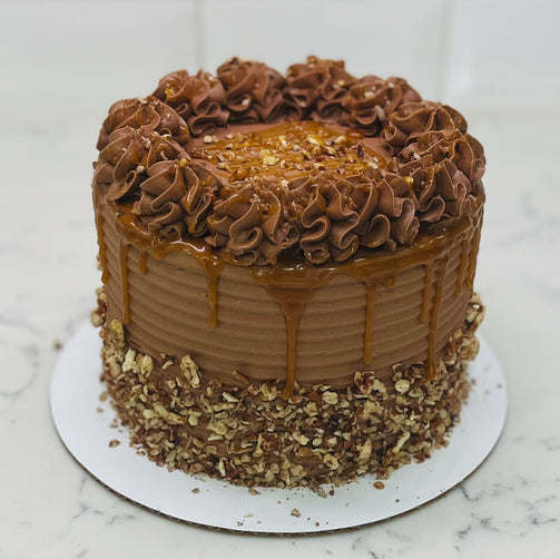 Our decadent chocolate cake with chocolate buttercream and layered with toasted pecans and caramel sauce.